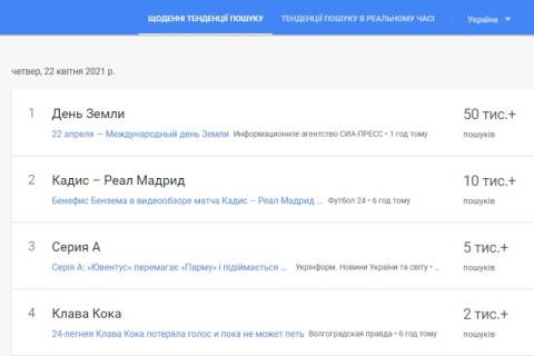 Сьогодні, 22 квітня, українці найбільше шукали у пошуковику Google інформацію про те, що щорічно цього дня відзначається Міжнародний День Землі – свято, що ознаменувало початок сучасного екологічного руху.