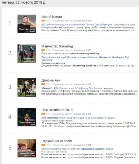 Сьогодні, 22 лютого, українці найбільше шукали у пошуковику Google інформацію, що вчора у Європі відбулися перші матчі 1/8 фіналу Ліги чемпіонів з футболу.