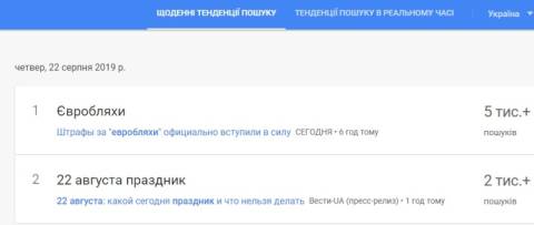 Сьогодні, 22 серпня, українці найбільше шукали у пошуковику Google інформацію, що цього дня набули чинності нові штрафні санкції для власників нерозмитнених автомобілів, відстрочені з 22 травня.