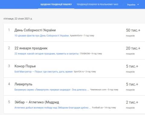 Сьогодні, 22 січня, українці найбільше шукали у пошуковику Google інформацію про те, що цього дня щорічно відзначається День Соборності, у день проголошення в 1919 році Акта злуки Української Народної Республіки та Західноукраїнської Народної Республіки.