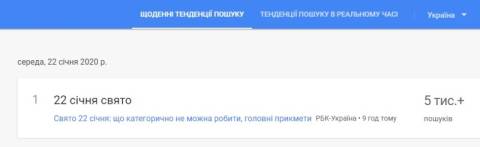 Сьогодні, 22 січня, українці найбільше шукали у пошуковику Google інформацію про те, що цього дня відзначається День соборності України. Це державне свято, яке з'явилося в 1919 році, в день проголошення Акту возз'єднання Української народної республіки та Західно-Української народної республіки.