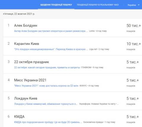 Сьогодні, 22 жовтня, українці найбільше шукали у пошуковику Google інформацію про те, що цього дня на знімальному майданчику в штаті Нью- Мексико американський актор Алек Болдуїн випадково вбив одну людину та поранив іншу.