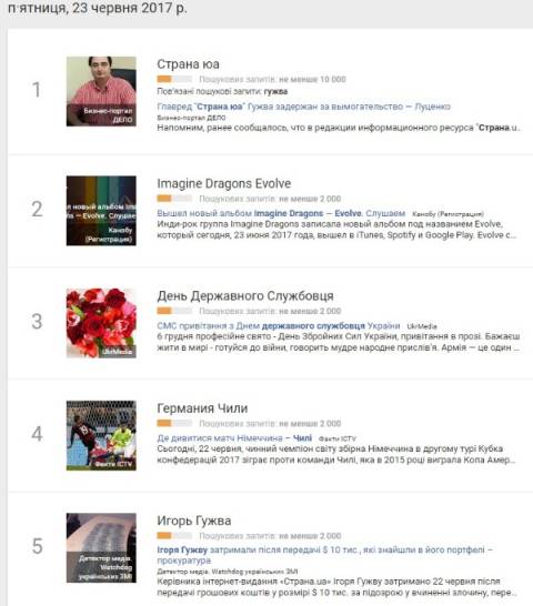Сьогодні, 23 червня, українці найбільше шукали у пошуковику Google інформацію про керівника інтернет-видання "Страна.ua" Ігоря Гужву, якого затримали вчора після передачі 10 тисяч доларів хабара.