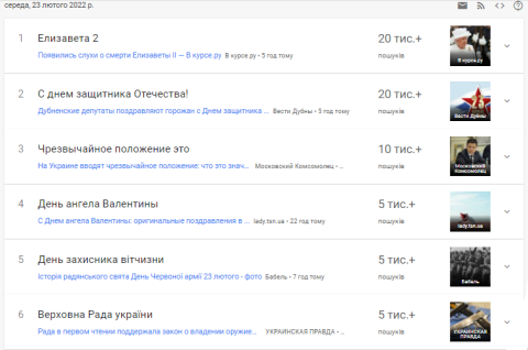 Сьогодні, 23 лютого, українці найбільше шукали у пошуковику Google інформацію про ймовірну смерть королеви Великобританії Єлизавети ІІ.