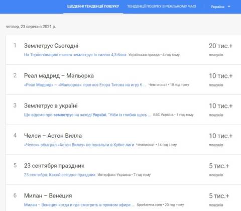 Сьогодні, 23 вересня, українці найбільше шукали у пошуковику Google інформацію про те, що вранці на межі Тернопільської та Івано-Франківської областей стався землетрус магнітудою 4,3 бала,