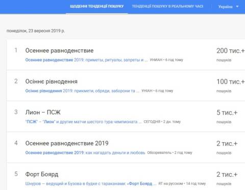 Сьогодні, 23 вересня, українці найбільше шукали у пошуковику Google інформацію про те, що цей день – день осіннього рівнодення, одного із двох днів у році, коли день дорівнює ночі.