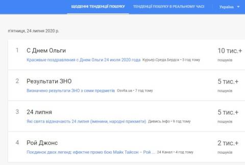 Сьогодні, 24 липня, українці найбільше шукали у пошуковику Google інформацію про те, що оголосили результати зовнішнього оцінювання з української мови і літератури, іноземних мов, історії України та біології.