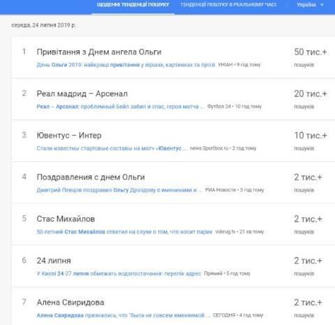 Сьогодні, 24 липня, українці найбільше шукали у пошуковику Google інформацію, що цього дня відзначається день пам'яті святої рівноапостольної великої княгині Ольги. Це одне з найпоширеніших імен в Україні.