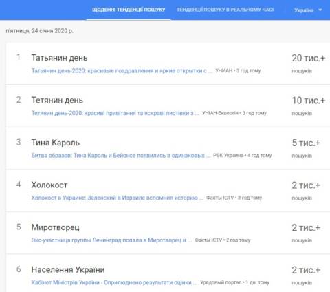 Сьогодні, 24 січня, українці найбільше шукали у пошуковику Google інформацію про те, що щороку 25 січня православні християни вшановують пам’ять святої великомучениці Татіани Римської. У день страти мучениці віруючі відзначають іменини Тетяни.