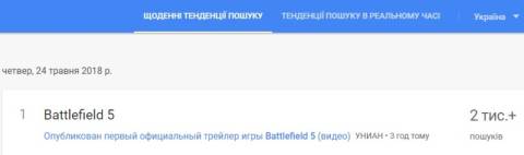 Сьогодні, 24 травня, українці найбільше шукали у пошуковику Google інформацію, що опубліковано перший офіційний трейлер гри Battlefield 5, вихід якої заплановано на 19 жовтня цього року.