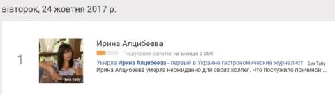 Сьогодні, 24 жовтня, українці найбільше шукали у пошуковику Google інформацію, що вчора померла відома українська ведуча і ресторанний критик Ірина Алцибєєва.