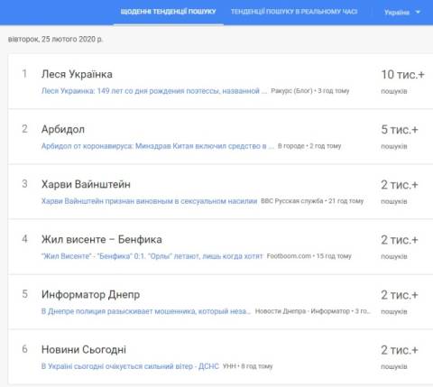 Сьогодні, 25 лютого, українці найбільше шукали у пошуковику Google інформацію про те, що цього дня виповнилося 149 років від дня народження письменниці та поетеси Лесі Українки, яку Іван Франко з захопленням і повагою називав "єдиним чоловіком в нашій літературі".