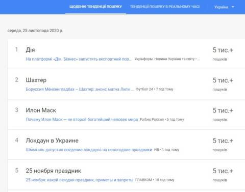 Сьогодні, 25 листопада, українці найбільше шукали у пошуковику Google інформацію про те, що на онлайн-платформі "Дія. Бізнес" планують запустити експортний портал, а також маркетплейс фінансових послуг для малого та середнього бізнесу.