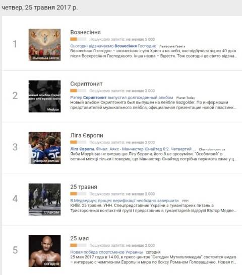 Сьогодні, 25 травня, українці найбільше шукали у пошуковику Google інформацію про те, що сьогодні церкви східного обряду, які святкували Великдень 16 квітня, відзначають Вознесіння Господнє.