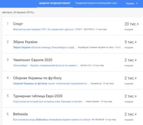 Сьогодні, 26 березня, українці найбільше шукали у пошуковику Google інформацію, що національна збірна України з футболу провела другий поєдинок у відбірковому турнірі чемпіонату Європи-2020, в якому на 8-тисячному стадіоні "Жозі Бартель" здобула перемогу над командою Люксембургу з рахунком 2:1.