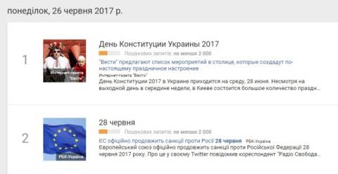 Окрім цього найбільше зацікавила українців новина про День Конституції 2017 в Україні, що припадає на 28 червня. День Конституції офіційно вихідний вже двадцять років.