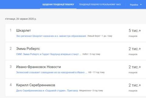 Сьогодні, 26 червня, українці найбільше шукали у пошуковику Google інформацію про те, що вчора Кабінет міністрів призначив Сергія Шкарлета заступником міністра освіти і виконувачем обов'язків міністра.