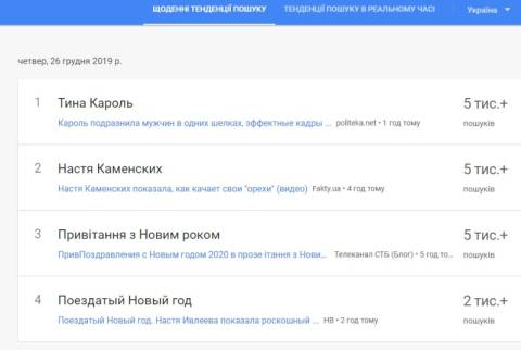 Сьогодні, 26 грудня, українці найбільше шукали у пошуковику Google інформацію, що українська виконавиця Тіна Кароль відзначилась черговим грандіозним концертом "Різдвяна історія з Тіною Кароль" у Києві.