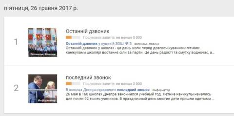 Сьогодні, 26 травня, українці найбільше шукали у пошуковику Google інформацію про те, що сьогодні в Україні святкують закінчення навчального року у школах.