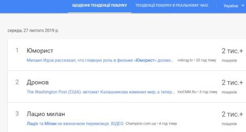 Сьогодні, 27 лютого, українці найбільше шукали у пошуковику Google інформацію, що у першому матчі півфіналу Кубка Італії з футболу ФК "Лаціо" на власному полі приймав ФК "Мілан".