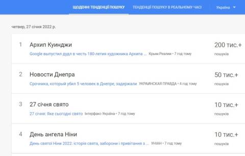 Сьогодні, 27 січня, українці найбільше шукали у пошуковику Google інформацію про те, що він випустив дудл, присвячений пейзажисту Архипу Куїнджі. У цю дату відзначається 180 років з дня народження художника, у доробку якого – понад 200 пейзажів.