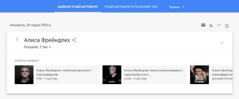 Сьогодні, 28 грудня, українці найбільше шукали у пошуковику Google інформацію про те, що у Санкт-Петербурзі з коронавірусом госпіталізували народну артистку СРСР Алісу Фрейндліх.