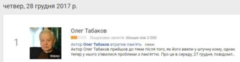 Сьогодні, 28 грудня, українці найбільше шукали у пошуковику Googe інформацію, що актор Олег Табаков втратив пам'ять.