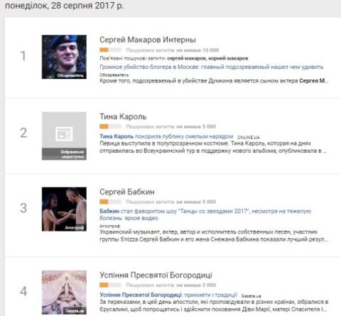 Окрім цього найбільше зацікавила українців новина, що український музикант, актор, автор та виконавець власних песен, учасник групи 5’nizza Сергій Бабкін та його дружина Сніжана Бабкіна показали найкращий результат на шоу "Танці зі зірками 2017", яке відбулося 27 серпня на телеканалі "1+1".