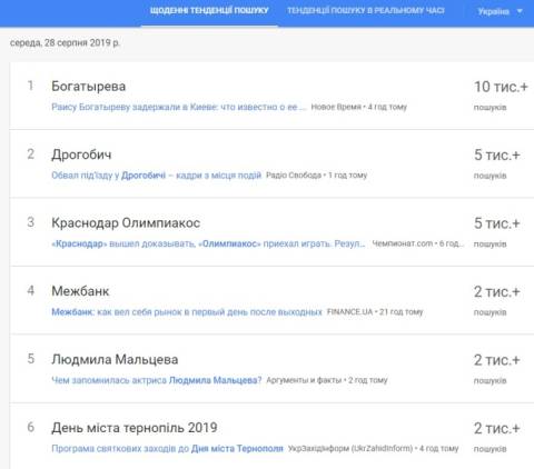 Сьогодні, 28 серпня, українці найбільше шукали у пошуковику Google інформацію, що сьогодні вночі у будинку на вул. Грушевського, 101/1 у Дрогобичі трапився обвал підїзду з першого по четвертий поверх, внаслідок чого загинули 2 людей, а 7 з травмами госпіталізували у лікарню. Під завалами можуть знаходитися ще 5 мешканців будинку.