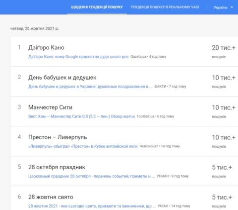 Сьогодні, 28 жовтня, українці найбільше шукали у пошуковику Google інформацію про те, що Google присвятив дудл 161-му дню народження дзюдоїста Дзіґоро Кано, який створив бойове мистецтво дзюдо.