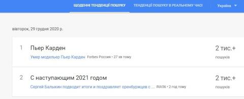 Сьогодні, 29 грудня, українці найбільше шукали у пошуковику Google інформацію про те, що цього дня помер всесвітньо відомий французький модельєр П'єр Карден у віці 98 років.