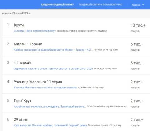 Сьогодні, 29 січня, українці найбільше шукали у пошуковику Google інформацію про те, що цього дня Україна вшановує пам'ять Героїв битви під Крутами.