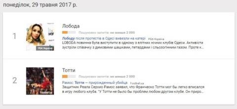 Сьогодні, 29 травня, українці найбільше шукали у пошуковику Google інформацію про те, що нападник італійської "Роми" Франческо Тотті зіграв свій останній матч у якості футболіста.