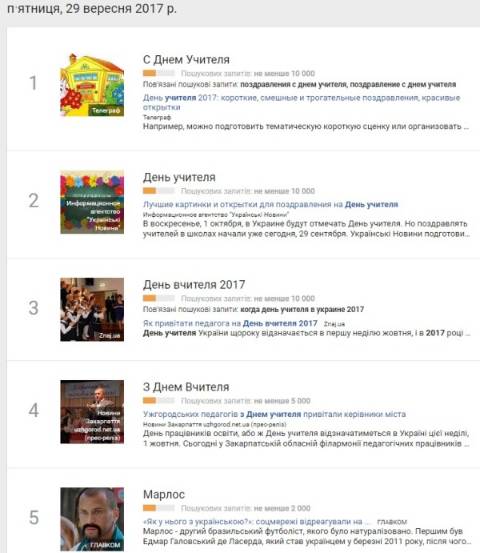 Сьогодні, 29 вересня, українці найбільше шукали у пошуковику Google інформацію, що щороку в першу неділю жовтня відзначається День учителя України.