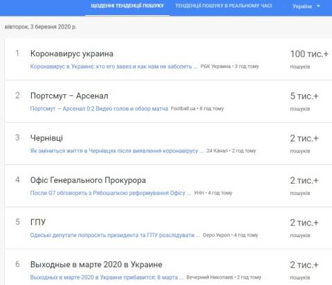 Сьогодні, 3 березня, українці найбільше шукали у пошуковику Google інформацію про те, що цього дня в Україні повідомили про перший підтверджений випадок зараження коронавірусом. Чоловік повернувся із Італії у кінці лютого.