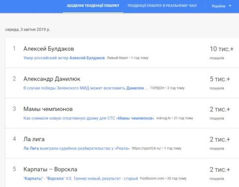 Сьогодні, 3 квітня, українці найбільше шукали у пошуковику Google інформацію, що колишній міністр фінансів України Олександр Данилюк може очолити Міністерство закордонних справ у випадку перемоги Володимира Зеленського на виборах президента. Про це повідомив народний депутат і радник Зеленського Сергій Лещенко.