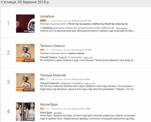 Сьогодні, 30 березня, українці найбільше шукали у пошуковику Google інформацію, що сьогодні оператор мобільного зв'язку "Vodafone Україна" запустив швидкісний 4G інтернет в діапазоні 2,6 ГГц у містах: Київ, Харків, Дніпро, Львів та Одеса.