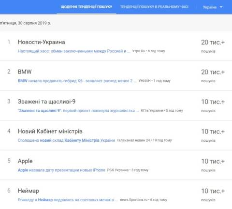 Сьогодні, 30 серпня, українці найбільше шукали у пошуковику Google інформацію, що цього дня до Києва прибуде літак із українськими полоненими, захопленими Росією. Однак в Офісі Президента України уже наголосили, що обмін полоненими ще не завершився, а жодного офіційного підтвердження, що обмін таки відбудеться, не з'явилось.