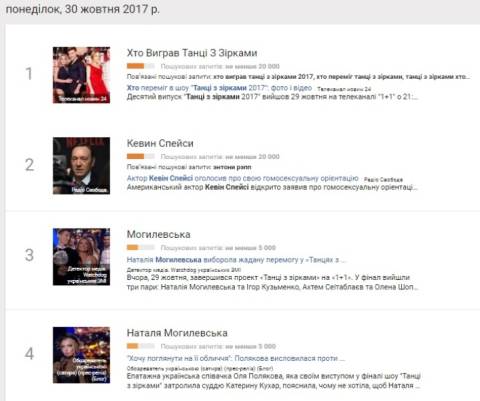 Сьогодні, 30 жовтня, українці найбільше шукали у пошуковику Google інформацію, що десятий випуск "Танці з зірками 2017" вийшов 29 жовтня на телеканалі "1+1" о 21:00 год.