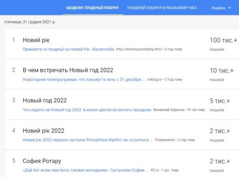 Сьогодні, 31 грудня, українці найбільше шукали у пошуковику Google інформацію про те, що у цей день в світі відзначаються Переддень Нового року, День прийняття рішення.