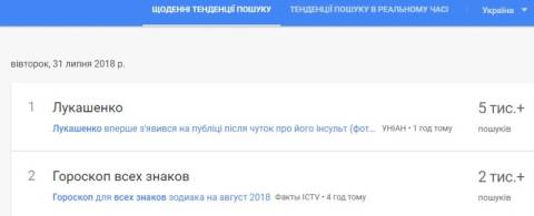 Сьогодні, 31 липня, українці найбільше шукали у пошуковику Google інформацію, що Президент Білорусії Олександр Лукашенко вперше за останні кілька днів після інсульту з'явився на публіці, зокрема він провів зустріч з головою Мінського облвиконкому Анатолієм Ісаченко.