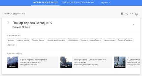 Сьогодні, 4 грудня, українці найбільше шукали у пошуковику Google інформацію, що сьогодні в центрі Одеси спалахнула пожежа в шестиповерховому будинку – пам'ятці архітектури, в якому знаходяться декілька навчальних закладів. За словами очевидців, люди, рятуючись від пожежі, вистрибували з вікон.