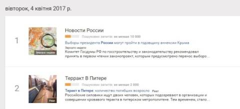 Сьогодні, 4 квітня, українці найбільше шукали у пошуковику Google інформацію про подробиці теракту в метро Санкт-Петербурга, який відбувся 3 квітня.