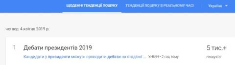 Сьогодні, 4 квітня, українці найбільше шукали у пошуковику Google інформацію, що за словами колишнього заступника голови Центральної виборчої комісії Андрія Магери, згідно з постановою ЦВК, офіційні теледебати кандидатів на пост глави держави мають відбуватися у приміщенні Національної суспільної телерадіокомпанії, а неофіційні можуть відбутися у будь-якому місці, про яке кандидати домовляться між собою.