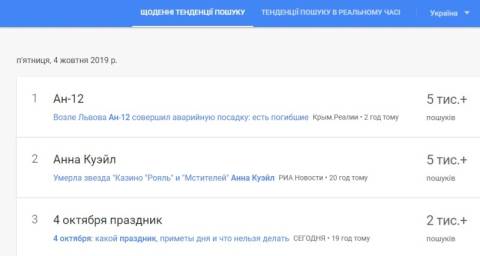 Сьогодні, 4 жовтня, українці найбільше шукали у пошуковику Google інформацію про те, що вранці поблизу села Солонка, на відстані 13,7 км до міжнародного аеропорту "Львів", впав транспортний літак Ан-12 авіакомпанії "Україна Аероальянс", який прямував з із Віго (Іспанія) до Стамбулу (Туреччина) і не мав сідати у Львові.