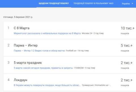 Сьогодні, 5 березня, українці найбільше шукали у пошуковику Google інформацію про те, що в Українському інституті національної пам'яті вважають, що дискусія, чи варто 8 березня залишати вихідним днем, не настільки важлива, як те, якими сенсами буде наповнена ця дата.