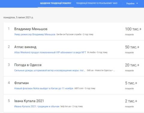 Сьогодні, 5 липня, українці найбільше шукали у пошуковику Google інформацію про те, що у Києві розпочинається музичний фестиваль Atlas Weekend, який проходитиме 5-11 липня з дотриманням всіх карантинних обмежень.