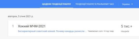 Сьогодні, 5 січня, українці найбільше шукали у пошуковику Google інформацію про те, що на молодіжному чемпіонаті світу з хокею відбулися півфінальні матчі, в яких Канада обіграла Росію, а США – Фінляндію.