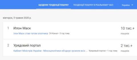 Сьогодні, 5 травня, українці найбільше шукали у пошуковику Google інформацію про те, що засновник компаній Tesla і SpaceX Ілон Маск вшосте став батьком: у нього й у співачки Граймс (Сі Буше) народився син.