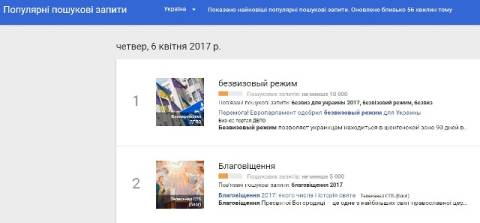 Сьогодні, 6 квітня, українці найбільше шукали у пошуковику Google інформацію про те, що сьогодні Європейський парламент проголосував за надання безвізового режиму для громадян України.